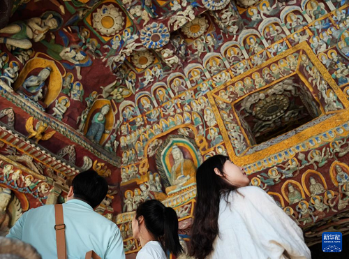 10月9日,在位于今潮8弄的戶外展區(qū),參觀者游覽云岡第12窟“音樂窟”的1:1復制洞窟。(新華社記者 劉穎 攝)