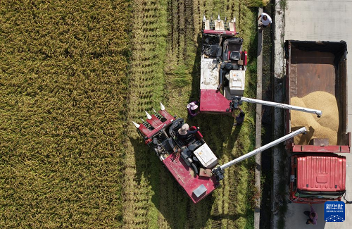 10月10日,湖北省宜昌市秭歸縣沙鎮(zhèn)溪鎮(zhèn)長(zhǎng)春村村民駕駛農(nóng)機(jī)在田間收獲水稻(無(wú)人機(jī)照片)。(新華社發(fā) 雷勇 攝)