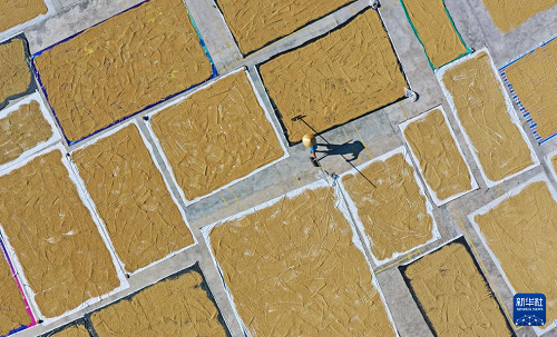 10月10日,浙江省臺(tái)州市仙居縣官路鎮(zhèn)增仁村農(nóng)民在晾曬稻谷(無(wú)人機(jī)照片)。(新華社發(fā) 王華斌 攝)