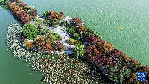 11月10日拍攝的南京玄武湖公園初冬景色(無人機照片)。(新華社發(fā) 孫忠南 攝)