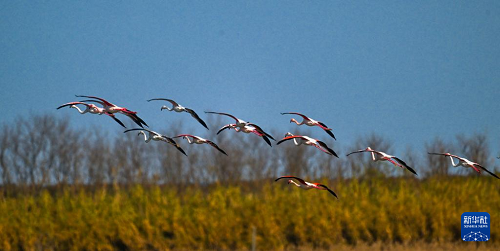 12月8日,火烈鳥在江蘇東臺條子泥濕地飛翔。(新華社發(fā) 孫家錄 攝)