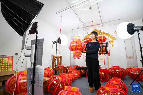 12月10日,在河北省石家莊市藁城區(qū)屯頭村一家宮燈銷(xiāo)售處,直播人員進(jìn)行線上銷(xiāo)售。(新華社發(fā) 張曉峰 攝)