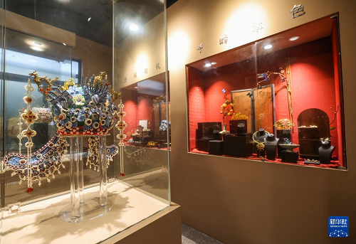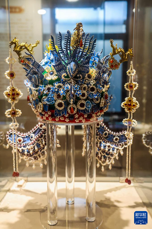 12月24日,這是位于匡堰鎮(zhèn)倡隆村的楝樹下藝術(shù)村落的花絲鑲嵌非遺工坊的展廳內(nèi)展示的六龍三鳳冠。(新華社記者 徐昱 攝)