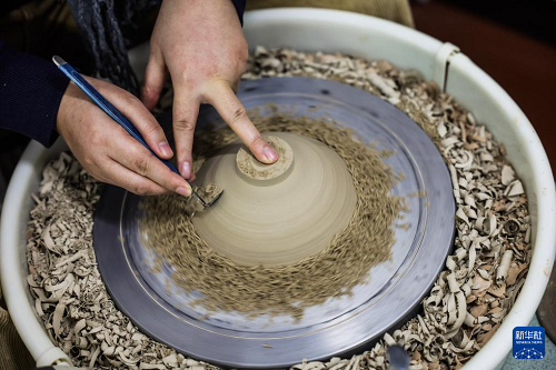 12月24日,侯夢露在位于匡堰鎮(zhèn)倡隆村的楝樹下藝術(shù)村落的東岙窯陶瓷藝術(shù)工作室內(nèi)進行青瓷制作流程中的修坯。(新華社記者 徐昱 攝)