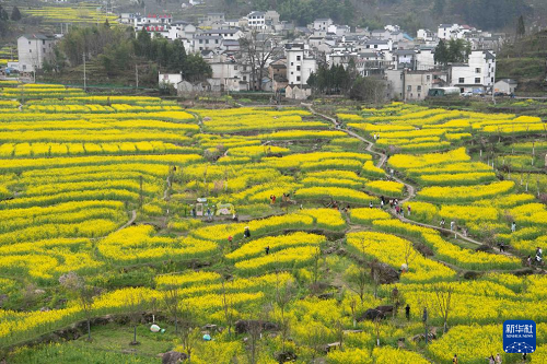 眼下,安徽省宣城市績溪縣家朋鄉(xiāng)幸福村的油菜花田進(jìn)入盛花期,大批游客來此踏青賞花。