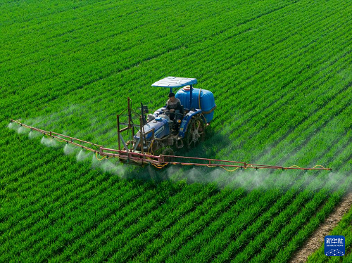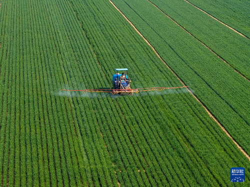 3月25日,河南省三門峽市靈寶市西閻鄉(xiāng)西古驛村農(nóng)民在麥田進行“一噴三防”作業(yè)(無人機照片)。(新華社發(fā) 杜杰 攝)