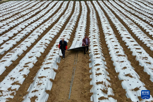 3月25日,貴州省畢節(jié)市赫章縣興發(fā)苗族彝族回族鄉(xiāng)農(nóng)民在田間進行覆膜作業(yè)(無人機照片)。(新華社發(fā) 江子鈺 攝)