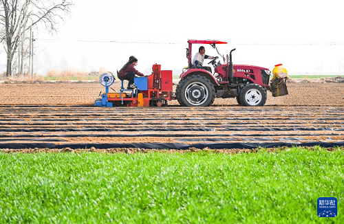 3月25日,河北省石家莊市行唐縣南橋鎮(zhèn)農(nóng)民駕駛農(nóng)機種植芋頭。(新華社發(fā) 張曉峰 攝)