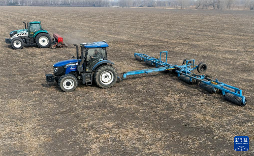 3月25日,播種機(jī)在位于黑龍江省哈爾濱市的北大荒集團(tuán)閆家崗農(nóng)場有限公司一處耕地上根據(jù)設(shè)定程序播種小麥。(新華社記者 王松 攝)