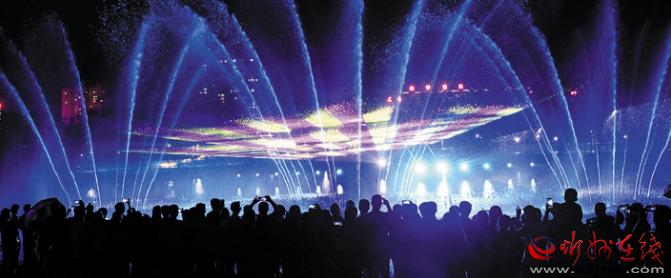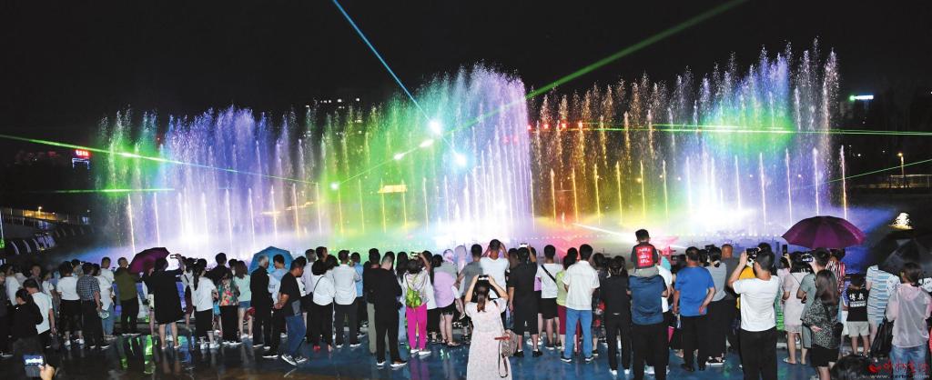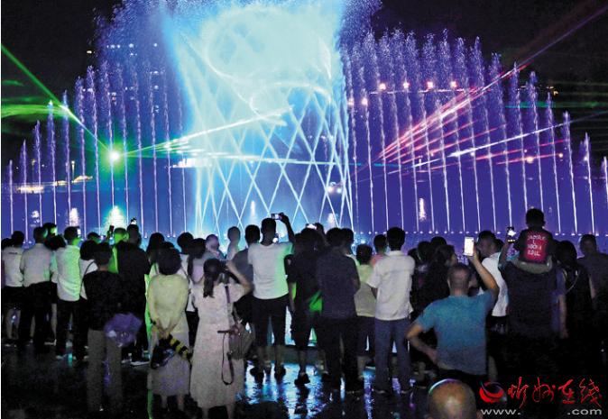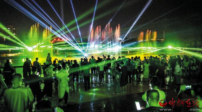 公園在注重園林、景觀建設的同時,突出主題文化內涵的展現,湖水噴泉、觀賞果園、主題植物園、階梯花臺等特色園林具有觀賞性,園內還配套建有遺山文化館、張拉膜廣場、健舞劇場、休閑茶吧、咖啡館等群眾休閑活動場所,是又一惠及民生的心靈家園。圖為8月1日晚,市民在遺山公園噴泉廣場觀賞絢麗多彩的噴泉燈光秀。劉紀森 智芝龍 白曉明 胡 煒 攝