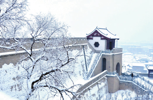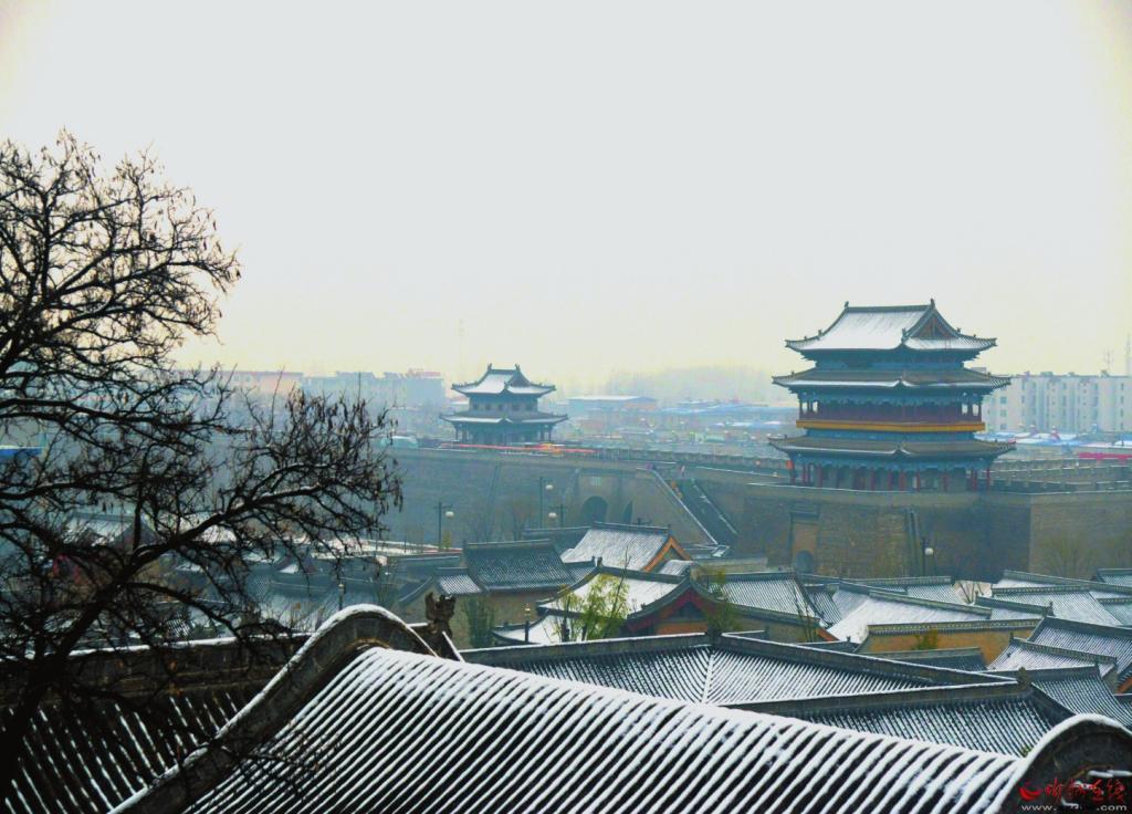 冬天一定要來忻州古城,因?yàn)檫@里的風(fēng)光大不一樣——它寒冷、莊嚴(yán),與遠(yuǎn)處的系舟山連成一片,煙波朦朧;它黯淡、粗獷,與整個(gè)北方的豪邁自成一體,氣勢磅礴。它就像這雪,能給人帶去希冀。雪安,忻州古城。
