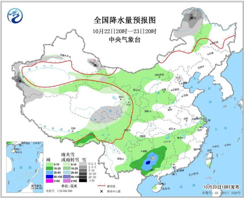10月22日20時至23日20時,新疆沿天山地區(qū)和南疆西部、青海東南部、西藏東北部及內(nèi)蒙古東北部、黑龍江西北部等地有小到中雪或雨夾雪,局地大雪(5~9毫米),西北地區(qū)東部、內(nèi)蒙古中西部、山西南部、西南地區(qū)東南部、江南中西部、華南大部等地有小雨,其中貴州東南部、廣西中北部等地有中到大雨,局地有暴雨(50~65毫米)。新疆東部部分地區(qū)有5~6級風(fēng)(見圖3)。