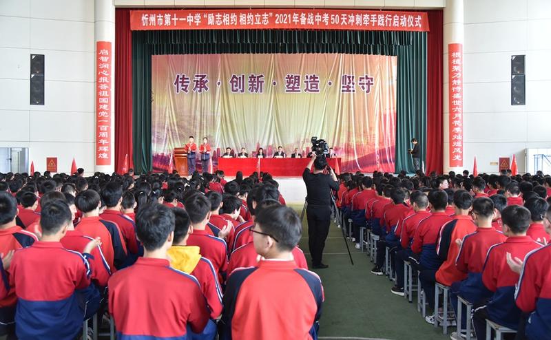 又是一年五月,陽光明媚,又逢“五四”,血脈僨張。在五月的花海中擁抱青春的時代,在初升的太陽下點(diǎn)燃生命的未來。為進(jìn)一步激發(fā)初三師生堅定目標(biāo)、奮力拼搏、沖刺中考的雄心壯志,5月4日上午,忻州市第十一中學(xué)初三年級全體師生在學(xué)校文體藝苑舉行了“勵志相約、相約立志”2021屆備戰(zhàn)中考50天沖刺牽手踐行啟動儀式,校長張云長、黨支部書記趙智剛、學(xué)校領(lǐng)導(dǎo)、部分家長代表共同見證了這一振奮人心的時刻。