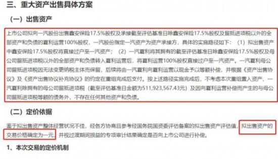 鑒于擬出售資產(chǎn)整體經(jīng)營(yíng)狀況不佳,經(jīng)各方協(xié)商且參考經(jīng)國(guó)務(wù)院國(guó)資委評(píng)估備案的擬出售資產(chǎn)評(píng)估值,一汽夏利擬出售資產(chǎn)的交易價(jià)格確定為1元。