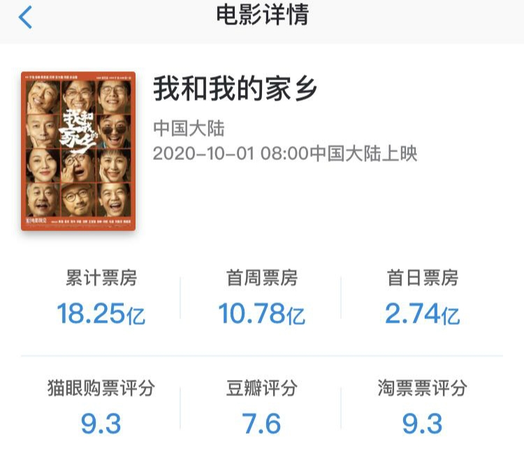 值得注意的是,國(guó)慶檔期間,《我和我的家鄉(xiāng)》連續(xù)8日實(shí)現(xiàn)單日票房過億。此外,該片在貓眼和淘票票評(píng)分均為9.3,實(shí)現(xiàn)了票房口碑雙豐收。