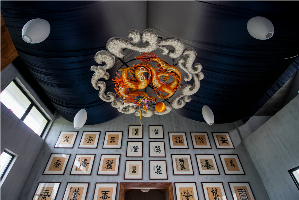 走入云龍村的云龍記憶館,縱使見多識廣,全國主流媒體記者們也依然被盤旋于頂?shù)拇T大金龍震撼到了,紛紛掏出手機拍個不停:這條金龍是用15000多個蠶繭制作而成,外圍是蠶繭組成的祥云,包裹著里面的金龍,這是云龍村的象征。
