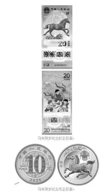 本次發(fā)行的2026年賀歲紀念幣面額10元,直徑27毫米,材質(zhì)為雙色銅合金材質(zhì),發(fā)行數(shù)量1億枚,正面為面額和年份,背面以剪紙風格馬形象為主,輔以花燈和萱草圖案,壁面左側(cè)刊“丙午”字樣。紀念鈔面額20元,票面長145毫米,寬70毫米,采用塑料材質(zhì),發(fā)行量1億張,正面為馬造型主景,背面描繪兒童歡慶鑼鼓場景,同時融合傳統(tǒng)裝飾和多民族文字元素。二者均為我國法定貨幣,每人預約、兌換限額均為20張(枚)。