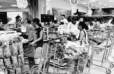 由于巴西通貨膨脹攀升導致消費不振,民眾購物更趨謹慎。圖為在里約熱內(nèi)盧一家超市,當?shù)孛癖娫诓少徤畋匦杵?。記?顏 歡攝