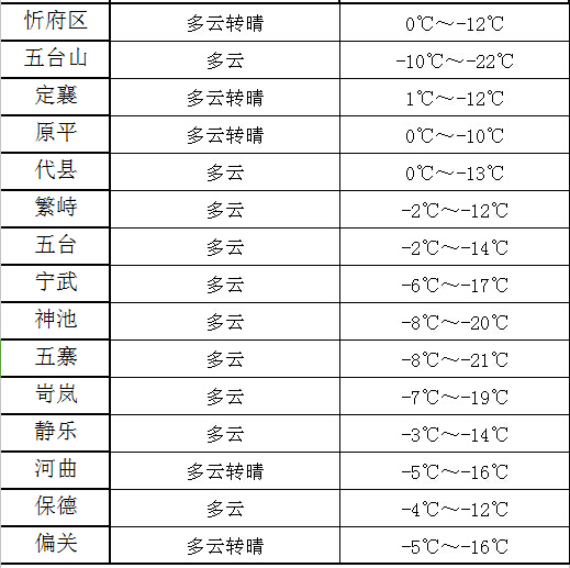 省氣象臺12日最新預報顯示,13日白天,全省陰天轉多云,晉中、長治、晉城等地的部分地區(qū)有雨夾雪或小雪;全省有4級至5級、短時7級以上西北風,氣溫明顯下降。最高氣溫為北部-6℃至-2℃,中部及南部山區(qū)-2℃至2℃,南部其余地區(qū)2℃至6℃。13日夜間至14日白天,全省多云轉晴天,有4級至5級西北風。最低氣溫為北部-16℃至-12℃,中部及南部山區(qū)-12℃至-8℃,南部其余地區(qū)-7℃至-3℃。14日夜間至15日白天,有4級左右西北風,最低氣溫為北部-17℃至-13℃,中部及南部山區(qū)-15℃至-10℃,南部其余地區(qū)-10℃至-6℃。