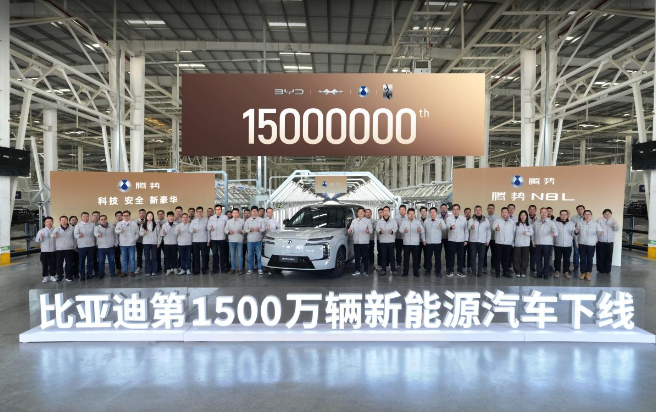 2025年12月18日,比亞迪第1500萬輛新能源汽車下線儀式在濟(jì)南工廠順利舉行,“大六座安全豪華SUV”騰勢N8L成為第1500萬輛下線車型,這也是騰勢N8L的第15000輛下線。比亞迪達(dá)成這一里程碑,用了整整17年,從1000萬到1500萬,只用了短短的13個(gè)月,再次刷新中國新能源汽車的“加速度”,也標(biāo)志著中國汽車工業(yè)正式邁入全球引領(lǐng)新階段。