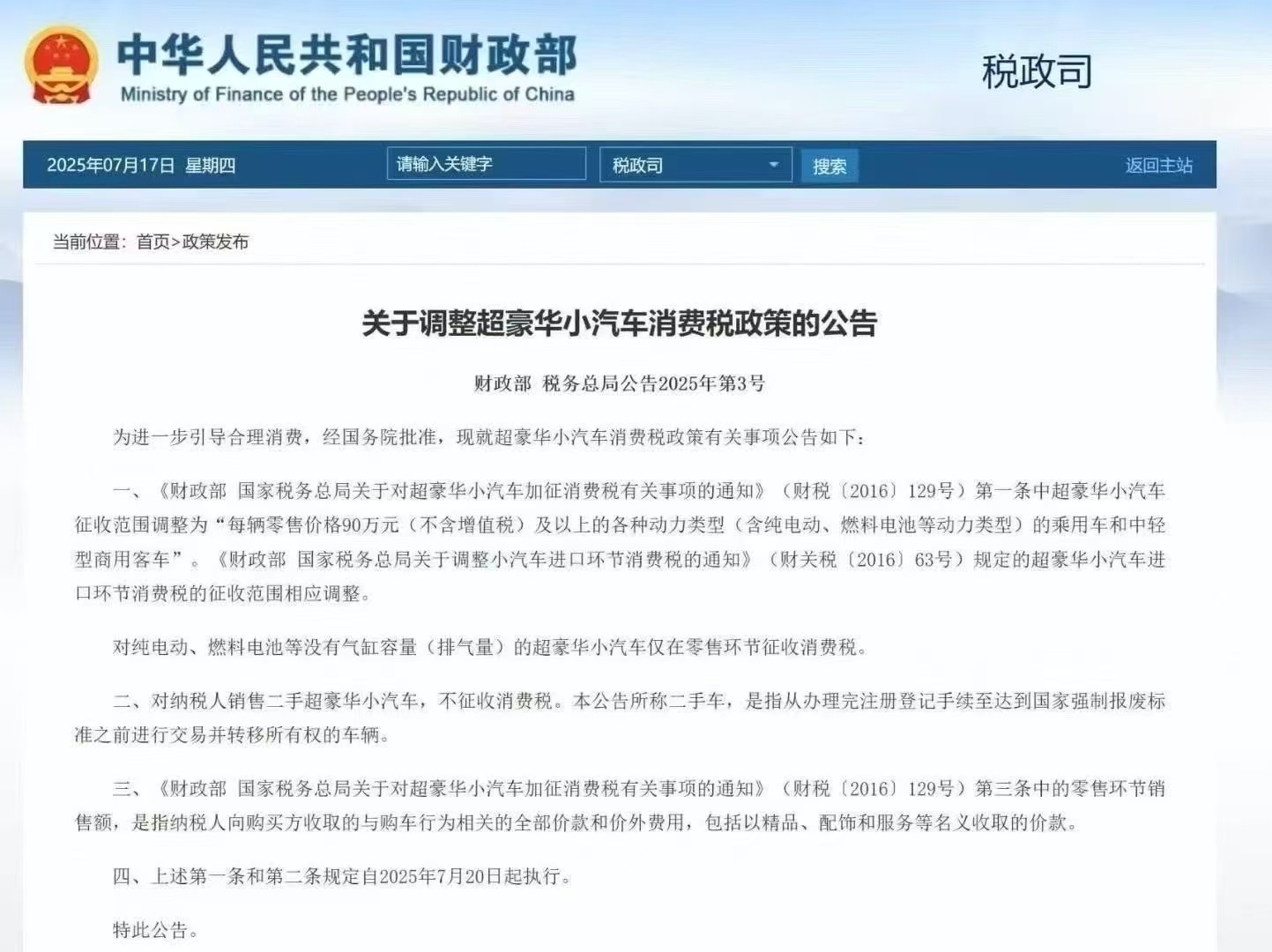 央廣網(wǎng)北京消息(記者董楠)7月17日,財(cái)政部、稅務(wù)總局聯(lián)合發(fā)布公告,對(duì)超豪華小汽車消費(fèi)稅政策作出調(diào)整。此次調(diào)整不僅將征稅門檻從130萬元(不含增值稅)降至90萬元,還在征稅環(huán)節(jié)、車型差異、二手車交易等方面做出明確規(guī)范,新政7月20日起正式執(zhí)行。這是2016年我國對(duì)超豪華小汽車加征消費(fèi)稅后的首次調(diào)整。