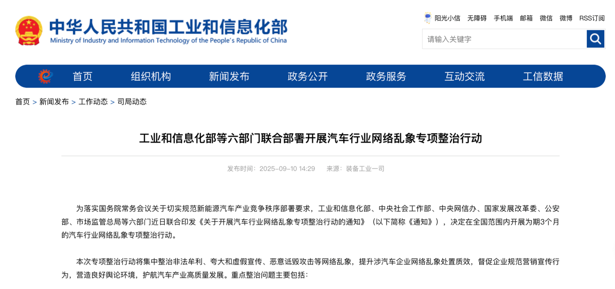 央廣網(wǎng)北京9月10日消息(記者董楠)9月10日,工業(yè)和信息化部(以下簡稱“工信部”)、中央社會工作部、中央網(wǎng)信辦、國家發(fā)展改革委、公安部、市場監(jiān)管總局等六部門聯(lián)合印發(fā)《關(guān)于開展汽車行業(yè)網(wǎng)絡(luò)亂象專項整治行動的通知》,決定在全國范圍內(nèi)開展為期3個月的汽車行業(yè)網(wǎng)絡(luò)亂象專項整治行動。