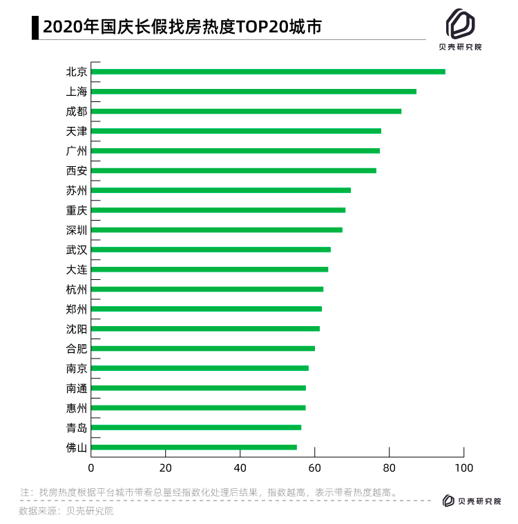 具體城市來看,一線城市中,北京、上??値Э礋岫戎笖?shù)分別為95和87.24,位居全國之首;深圳總帶看熱度指數(shù)為67.37,在四個(gè)一線城市中排在最后。