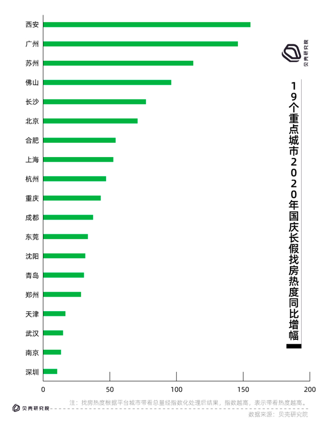 10月9日,貝殼找房發(fā)布了2020年城市“十一”找房熱度(二手房市場),全國多個(gè)城市找房活躍度同比去年均不同程度增長,其中西安、廣州、蘇州樓市相對(duì)火熱,經(jīng)紀(jì)人總帶看量同比出現(xiàn)了翻倍增長;而深圳、南京樓市趨冷,總帶看量增幅排在19個(gè)重點(diǎn)城市最后。