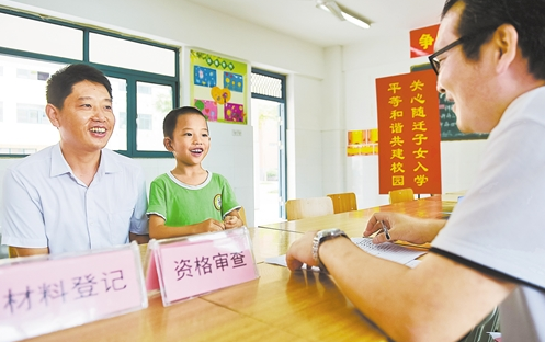 在安徽合肥市和平小學(xué)花沖分校報(bào)名點(diǎn),畢權(quán)航和父親畢金倉(cāng)(左)在辦理報(bào)名入學(xué)相關(guān)手續(xù)(2017年7月12日攝)。合肥市瑤海區(qū)進(jìn)城務(wù)工人員隨遷子女入學(xué)報(bào)名工作啟動(dòng)后,該區(qū)教育部門在各定點(diǎn)學(xué)校設(shè)置“隨遷子女入學(xué)幫你辦”窗口,安排工作人員協(xié)助辦理,同時(shí)設(shè)置家長(zhǎng)意見箱,監(jiān)督入學(xué)辦理的全過(guò)程。 新華社記者 張 端攝