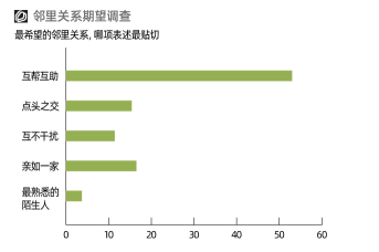除了以上硬件設施環(huán)境,鄰里關系這樣的軟性條件也極大影響人們居住質量。和“年輕人不愛社交”這樣的普遍認知不同,調研發(fā)現(xiàn)53%受訪者期待互幫互助的鄰里關系,更有16.5%的人希望和鄰居親如一家。“遠親不如近鄰”,在當下依然沒有過時。