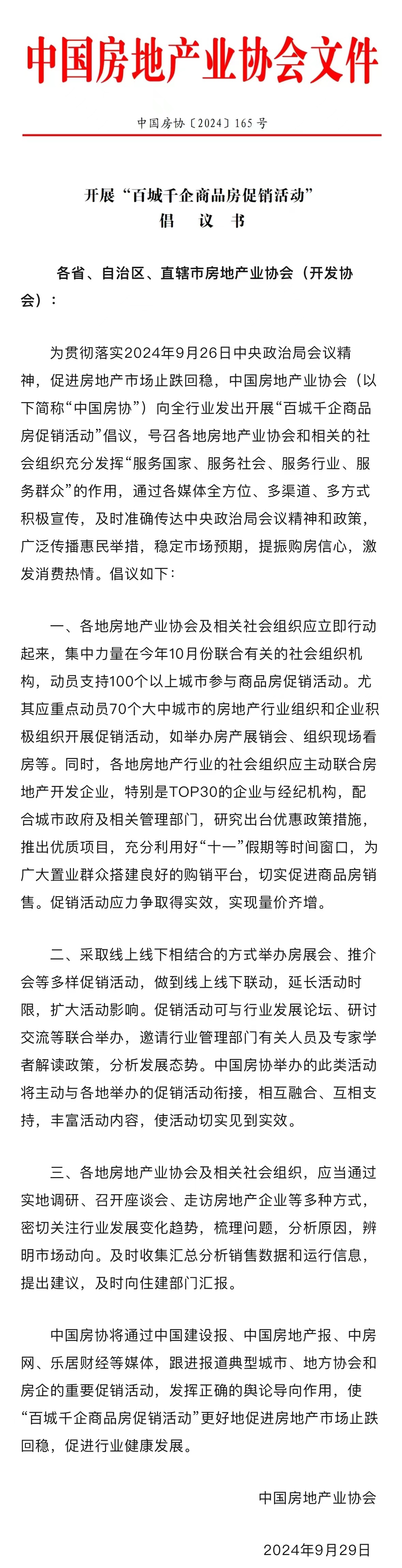 央廣網(wǎng)北京10月11日消息(記者安垚)據(jù)中國(guó)房地產(chǎn)業(yè)協(xié)會(huì)微信公眾號(hào)消息,為貫徹落實(shí)9月26日中央政治局會(huì)議精神,促進(jìn)房地產(chǎn)市場(chǎng)止跌回穩(wěn),在住房和城鄉(xiāng)建設(shè)部的指導(dǎo)下,9月29日,中國(guó)房地產(chǎn)業(yè)協(xié)會(huì)(以下簡(jiǎn)稱(chēng)“中國(guó)房協(xié)”)發(fā)出開(kāi)展“百城千企商品房促銷(xiāo)活動(dòng)”倡議。