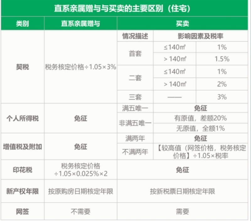 對(duì)此,北京鏈家簽約服務(wù)中心相關(guān)負(fù)責(zé)人表示,在直系親屬間進(jìn)行房屋轉(zhuǎn)移(過(guò)戶)時(shí),贈(zèng)與和買賣是兩種常見的方式。雖然它們的目的相似,但在稅費(fèi)方面卻存在顯著的區(qū)別。其中,贈(zèng)與方式涉及契稅、印花稅,買賣方式則涉及契稅、個(gè)人所得稅、增值稅及附加、印花稅,具體可見下表。