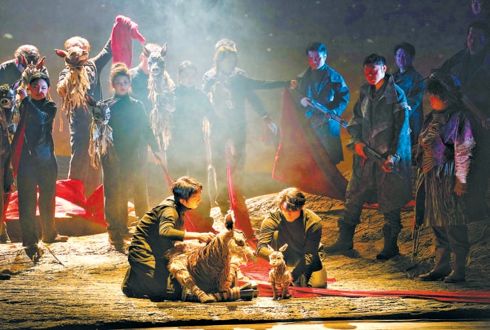在舞臺(tái)呈現(xiàn)上,舞美設(shè)計(jì)常煒以“山的血脈”為核心意象,山體內(nèi)部的紋理宛若血液流動(dòng),山石土地俱在跳動(dòng)、呼吸。整體來(lái)說(shuō),《可可西里》的舞臺(tái)置景變化并不劇烈,燈光、景片以及經(jīng)幡等裝飾以恰到好處的力度表明時(shí)間地點(diǎn)的轉(zhuǎn)換,暗喻劇情和人物內(nèi)心的走向——在有些舞臺(tái)作品選擇以噱頭和炫技招攬觀眾的當(dāng)下,《可可西里》流淌著一種久違的、質(zhì)樸的暖意,主創(chuàng)團(tuán)隊(duì)為這部作品付出了足夠的誠(chéng)意,比如,無(wú)論是電影《可可西里》,還是人們對(duì)這片凈土的既有認(rèn)知,動(dòng)物都在其中扮演重要的角色,但毫無(wú)疑問,要在舞臺(tái)上把動(dòng)物塑造得真實(shí)且有藝術(shù)表現(xiàn)力,并不容易。主創(chuàng)團(tuán)隊(duì)沒有偷工減料地繞過這個(gè)難題,而是以模仿動(dòng)物習(xí)性的“偶”代替,當(dāng)從“母羊”的腹中剖開一卷鮮紅的長(zhǎng)綢,“小羊”跌跌撞撞地學(xué)著起身時(shí),溫柔灑落的天光配合層層遞進(jìn)的音樂,把現(xiàn)場(chǎng)氣氛推向一次動(dòng)人的高潮。