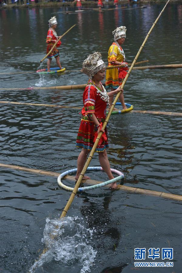 1月1日,“獨竹漂”愛好者在花溪河上表演水上高難度平衡動作。 2016年元旦,在貴陽市花溪公園平橋河段舉行的貴陽市第31屆冬泳表演活動中,數十名“獨竹漂”愛好者在花溪河上腳踏漂浮的竹竿,表演“金雞獨立”、轉身平衡等高難度動作,讓觀眾大飽眼福。新華社發(fā)(秦剛 攝)
