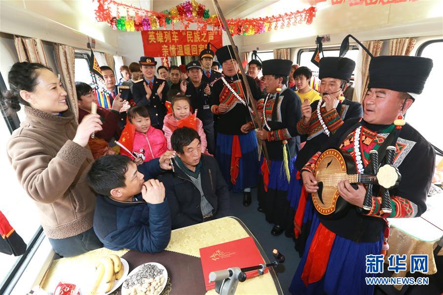 2月1日,彝族藝術(shù)家在K165次列車上為旅客表演。當日,在西安鐵路局西安至昆明的K165次列車上,四川美姑縣原生態(tài)畢摩樂隊與西安客運段職工民樂小分隊聯(lián)合舉辦“英雄列車民族之聲親情溫暖回家路”音樂會,畢摩樂隊用口弦、哈門、木葉、瑪布等彝族民間樂器演奏的音樂為返鄉(xiāng)過年的旅客提前送上新年祝福。民間藝術(shù)家和列車乘務(wù)員還為旅客們送上“?!弊?、春聯(lián)。新華社發(fā)
