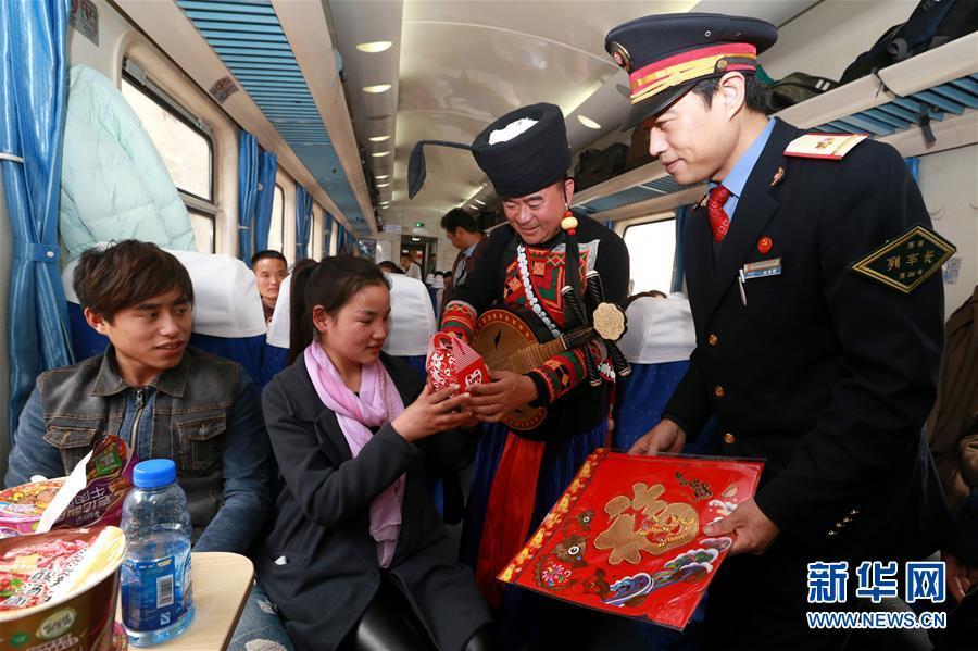 2月1日,彝族藝術(shù)家在K165次列車上為旅客表演。當日,在西安鐵路局西安至昆明的K165次列車上,四川美姑縣原生態(tài)畢摩樂隊與西安客運段職工民樂小分隊聯(lián)合舉辦“英雄列車民族之聲親情溫暖回家路”音樂會,畢摩樂隊用口弦、哈門、木葉、瑪布等彝族民間樂器演奏的音樂為返鄉(xiāng)過年的旅客提前送上新年祝福。民間藝術(shù)家和列車乘務(wù)員還為旅客們送上“?!弊?、春聯(lián)。新華社發(fā)