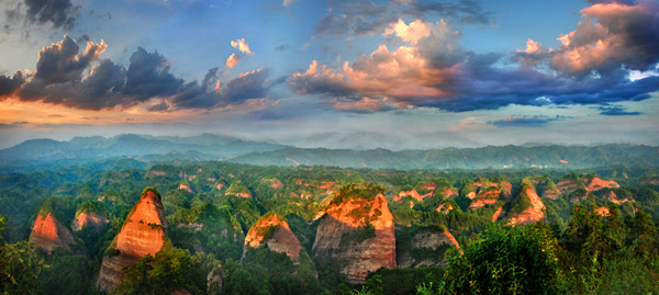 萬(wàn)佛山地處云貴高原向南嶺山地的過(guò)渡地帶。經(jīng)數(shù)以?xún)|年的流水、風(fēng)化地質(zhì)作用,逐漸發(fā)育呈現(xiàn)出丹霞赤壁、石嶺、石寨、石柱、石橋、一線(xiàn)天、狹谷、溝巷等奇特的丹霞地貌自然景觀(guān)。域內(nèi)丹霞峰林拔地而起,巍巍陣列,尤如一幅天然水墨長(zhǎng)卷。登臨萬(wàn)佛山主峰山頂,俯視峰林,氣勢(shì)磅礴,向西南可望海神龜活神活現(xiàn);向北望毛蠟燭峰、天書(shū)巖、夫妻巖形象逼真;向南可遠(yuǎn)眺將軍山主峰及該將軍山景區(qū)螺絲峰和神仙洞景區(qū)大寨巖主峰及神仙山主峰。群峰列陣,萬(wàn)佛朝宗,不愧為“丹霞群峰第一山”。