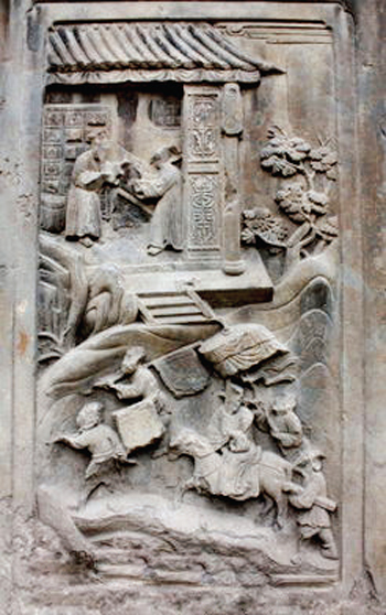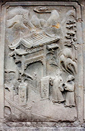 配坊實際上是一座功名石牌坊,上面刊載著武訪疇一家四代人的姓名及朝廷贈封的官爵,咸豐六年(1856)由武訪疇修建。這座石雕牌坊與其它牌坊最大的區(qū)別就是沒有題刻坊名,因此只能稱之為配坊。坐北向南,為四柱三間三樓單檐歇山頂結(jié)構(gòu),牌樓高8米,寬12米,坊體坐落在近1米高的長方形臺基上,立柱仍然采用夾柱石固定。坊頂覆蓋青瓦,正脊飾石雕貔貅裝飾,飛檐翹角,明樓檐下為“圣旨”牌,當心間設(shè)兩層小字板,第一層題刻:“贈資政大夫曾祖父廷桂,贈夫人曾祖母李氏;誥贈資政大夫祖父秉壁,誥贈夫人祖母吳氏;誥贈資政大夫父烈,誥封夫人母朱氏。陜西分巡延榆綏兵備道、加四級武訪疇謹建?!钡诙宇}刻“大清咸豐六年歲次丙辰仲夏上院榖旦”。武訪疇借建坊要弘揚祖輩陰德,而祖輩的姓氏大名又不能題刻在母親的節(jié)孝牌坊上,所以,他必須另建一坊才能完整地表達心愿。實際上,這就是建造配坊的真正目的。也正因此在配坊題刻“龍光錫寵”、“鳳詔褒榮”、“克成先志”、“重裕后昆”等。