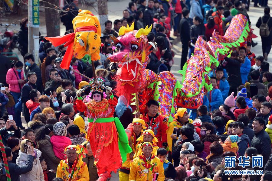 2月21日,社火隊(duì)在進(jìn)行巡游拜年。當(dāng)日,有著千年歷史的傳統(tǒng)村落——山東省章丘市三德范村組織31個(gè)社火隊(duì)舉行社火巡游拜年活動,在元宵佳節(jié)來臨之際為鄉(xiāng)親們送祝福。新華社記者 郭緒雷攝