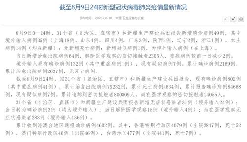 情況顯示,截至8月9日24時,據(jù)31個省(自治區(qū)、直轄市)和新疆生產(chǎn)建設兵團報告,現(xiàn)有確診病例802例(其中重癥病例41例),累計治愈出院病例79232例,累計死亡病例4634例,累計報告確診病例84668例,現(xiàn)有疑似病例7例。累計追蹤到密切接觸者800809人,尚在醫(yī)學觀察的密切接觸者24055人。