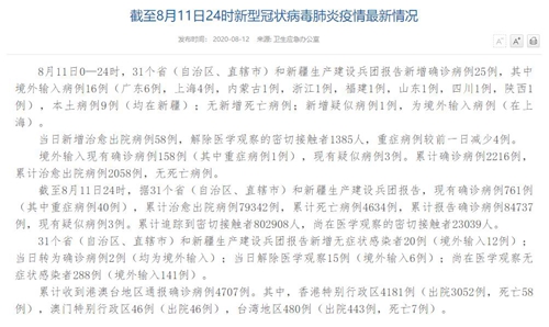 情況顯示,截至8月11日24時(shí),據(jù)31個(gè)省(自治區(qū)、直轄市)和新疆生產(chǎn)建設(shè)兵團(tuán)報(bào)告,現(xiàn)有確診病例761例(其中重癥病例40例),累計(jì)治愈出院病例79342例,累計(jì)死亡病例4634例,累計(jì)報(bào)告確診病例84737例,現(xiàn)有疑似病例3例。累計(jì)追蹤到密切接觸者802908人,尚在醫(yī)學(xué)觀察的密切接觸者23039人。