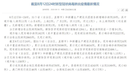 情況顯示,截至8月12日24時,據(jù)31個?。ㄗ灾螀^(qū)、直轄市)和新疆生產(chǎn)建設兵團報告,現(xiàn)有確診病例724例(其中重癥病例41例),累計治愈出院病例79398例,累計死亡病例4634例,累計報告確診病例84756例,現(xiàn)有疑似病例4例。累計追蹤到密切接觸者803651人,尚在醫(yī)學觀察的密切接觸者22498人。