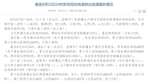 人民網(wǎng)北京8月24日電(董童)國家衛(wèi)生健康委于今日在官網(wǎng)發(fā)布的《截至8月23日24時新型冠狀病毒肺炎疫情最新情況》(以下簡稱“情況”)提出,8月23日0—24時,31個?。ㄗ灾螀^(qū)、直轄市)和新疆生產(chǎn)建設兵團報告新增確診病例16例,均為境外輸入病例(上海5例,福建3例,四川3例,云南3例,山西1例,山東1例);無新增死亡病例;新增疑似病例1例,為境外輸入病例(在上海)。當日新增治愈出院病例30例,解除醫(yī)學觀察的密切接觸者1375人,重癥病例較前一日減少2例。