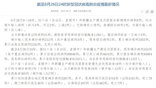 人民網(wǎng)北京8月27日電(董童)國(guó)家衛(wèi)生健康委于今日在官網(wǎng)發(fā)布的《截至8月26日24時(shí)新型冠狀病毒肺炎疫情最新情況》(以下簡(jiǎn)稱“情況”)提出,8月26日0—24時(shí),31個(gè)省(自治區(qū)、直轄市)和新疆生產(chǎn)建設(shè)兵團(tuán)報(bào)告新增確診病例8例,均為境外輸入病例(四川4例,河北2例,上海2例);無(wú)新增死亡病例;新增疑似病例1例,為境外輸入病例(在上海)。當(dāng)日新增治愈出院病例31例,解除醫(yī)學(xué)觀察的密切接觸者1189人,重癥病例較前一日減少3例。
