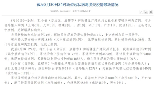 情況顯示,截至8月30日24時,據(jù)31個?。ㄗ灾螀^(qū)、直轄市)和新疆生產(chǎn)建設(shè)兵團(tuán)報告,現(xiàn)有確診病例237例(其中重癥病例4例),累計治愈出院病例80177例,累計死亡病例4634例,累計報告確診病例85048例,無現(xiàn)有疑似病例。累計追蹤到密切接觸者814852人,尚在醫(yī)學(xué)觀察的密切接觸者7190人。