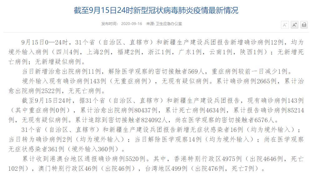 情況顯示,截至9月15日24時,據(jù)31個省(自治區(qū)、直轄市)和新疆生產(chǎn)建設(shè)兵團報告,現(xiàn)有確診病例143例(其中重癥病例0例),累計治愈出院病例80437例,累計死亡病例4634例,累計報告確診病例85214例,無現(xiàn)有疑似病例。累計追蹤到密切接觸者824092人,尚在醫(yī)學(xué)觀察的密切接觸者6576人。
