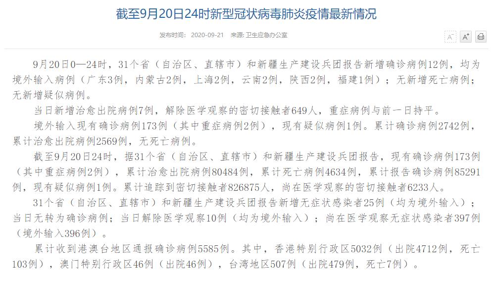 人民網(wǎng)北京9月21日電(董童)國家衛(wèi)生健康委于今日在官網(wǎng)發(fā)布的《截至9月20日24時新型冠狀病毒肺炎疫情最新情況》(以下簡稱“情況”)提出,9月20日0—24時,31個?。ㄗ灾螀^(qū)、直轄市)和新疆生產(chǎn)建設(shè)兵團報告新增確診病例12例,均為境外輸入病例(廣東3例,內(nèi)蒙古2例,上海2例,云南2例,陜西2例,福建1例);無新增死亡病例;無新增疑似病例。當(dāng)日新增治愈出院病例7例,解除醫(yī)學(xué)觀察的密切接觸者649人,重癥病例與前一日持平。