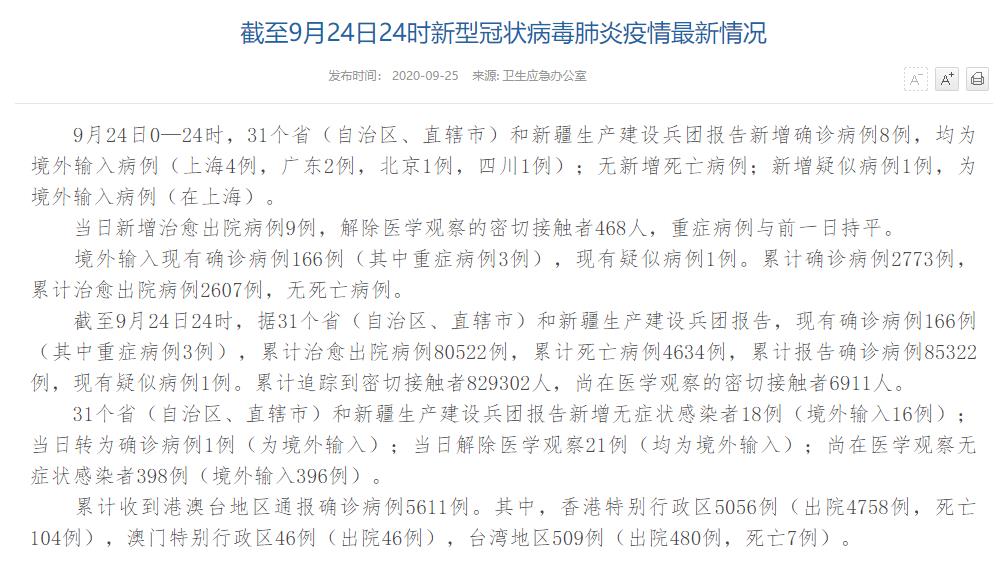 人民網(wǎng)北京9月25日電(董童)國家衛(wèi)生健康委于今日在官網(wǎng)發(fā)布的《截至9月24日24時新型冠狀病毒肺炎疫情最新情況》(以下簡稱“情況”)顯示,9月24日0—24時,31個?。ㄗ灾螀^(qū)、直轄市)和新疆生產(chǎn)建設兵團報告新增確診病例8例,均為境外輸入病例(上海4例,廣東2例,北京1例,四川1例);無新增死亡病例;新增疑似病例1例,為境外輸入病例(在上海)。當日新增治愈出院病例9例,解除醫(yī)學觀察的密切接觸者468人,重癥病例與前一日持平。