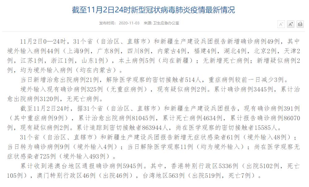 人民網(wǎng)北京11月3日電(董童)國家衛(wèi)生健康委于今日在官網(wǎng)發(fā)布的《截至11月2日24時(shí)新型冠狀病毒肺炎疫情最新情況》(以下簡稱“情況”)指出,11月2日0—24時(shí),31個(gè)省(自治區(qū)、直轄市)和新疆生產(chǎn)建設(shè)兵團(tuán)報(bào)告新增確診病例49例,其中境外輸入病例44例(上海9例,廣東8例,四川8例,內(nèi)蒙古4例,福建4例,湖北4例,北京2例,天津2例,江蘇1例,浙江1例,山東1例),本土病例5例(均在新疆);無新增死亡病例;新增疑似病例2例,均為境外輸入病例(均在內(nèi)蒙古)。當(dāng)日新增治愈出院病例21例,解除醫(yī)學(xué)觀察的密切接觸者514人,重癥病例較前一日減少3例。