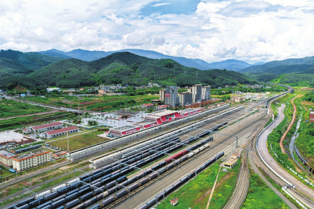 9月21日,中老鐵路上的貨運列車在磨憨站通過。記者獲悉,中老鐵路開通運營以來,截至9月19日,全線累計開行貨物列車突破6萬列,貨運量超6760萬噸,其中跨境貨物運輸突破1500萬噸。